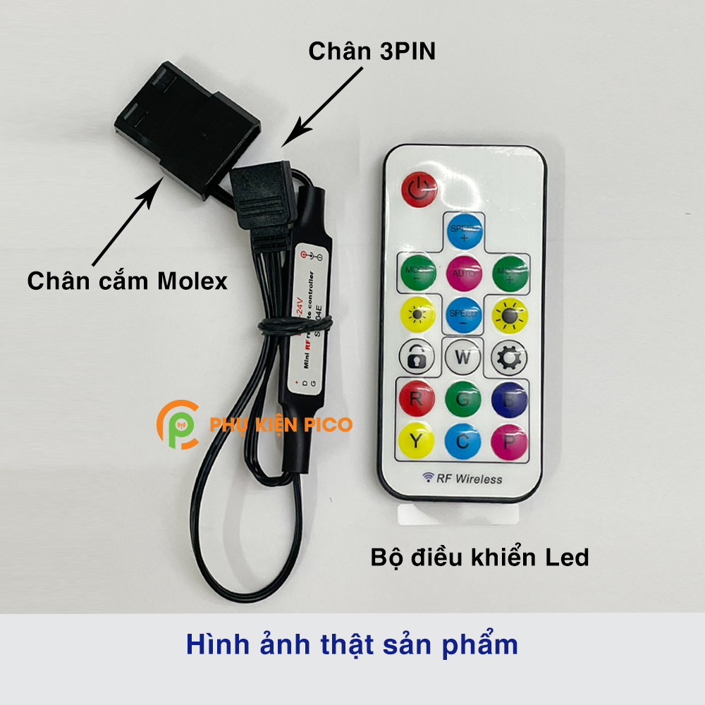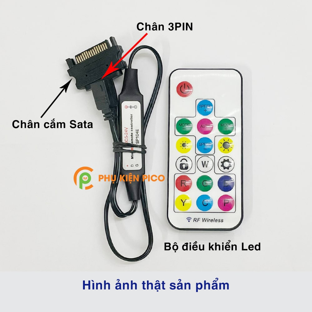 - Bộ sản phẩm mới 100%, phụ kiện bao gồm: 1 Remote không dây + 1 dây nối vào nguồn máy tính cổng Molex hoặc SATA + đầu ghim 5v 3-pin (khuyết 1 chân).