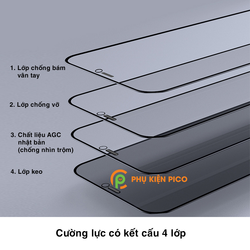 • Cường lực kết cấu gồm 4 lớp: Lớp chống bám vân tay, lớp chống vỡ, lớp chống nhìn trộm, lớp keo.