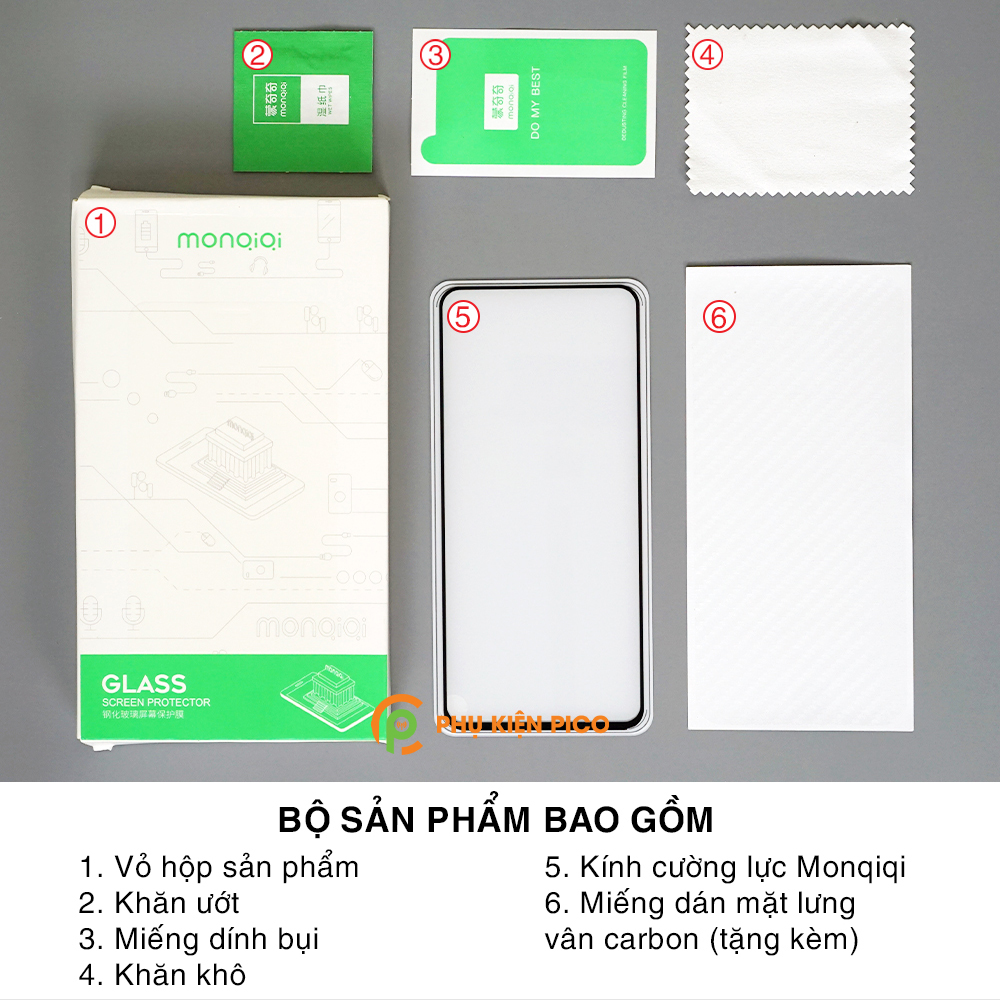 • Sản phẩm gồm có: 1 cường lực viền đen Monqiqi + Tặng kèm (lọ dầu chống hở viền, giấy lau khô, giấy lau ướt, miếng dính bụi).