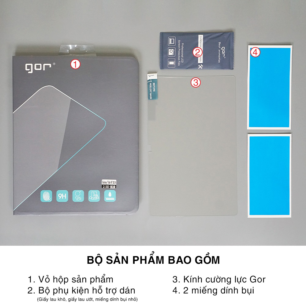 - Bộ sản phẩm nguyên box gồm có: 1 miếng kính cường lực Gor + Tặng kèm (lọ keo tra viền, giấy lau khô, giấy lau ướt, miếng dính bụi, giấy hướng dẫn dán).