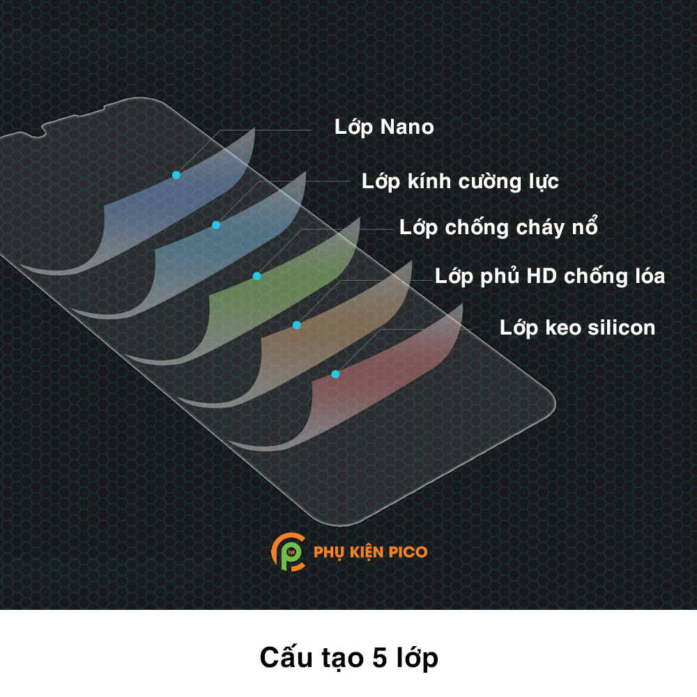 • Cấu tạo 5 lớp: Lớp Nano, Lớp kính cường lực, Lớp bảo vệ chống cháy nổ, Lớp phủ HD chống lóa, Lớp keo silicon.