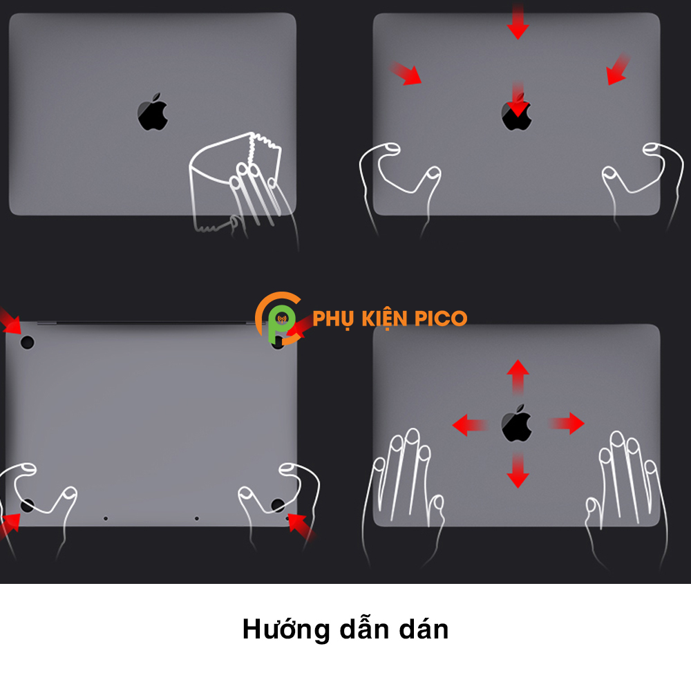 - Bước 2: Gỡ mặt số 1 trước điều chỉnh tấm dán sao cho vừa khít với mặt lưng (mặt đáy) và thả để miếng dán bám hoàn toàn vào Macbook.