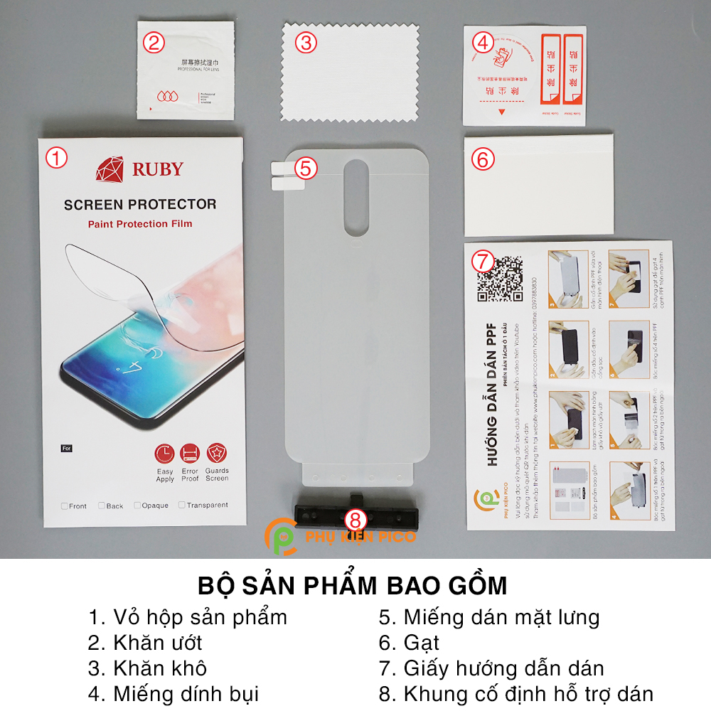• Sản phẩm gồm có: 1 miếng dán lưng + Tặng kèm (1 miếng gạt hỗ trợ dán, giấy lau khô, giấy lau ướt, giấy dính bụi).