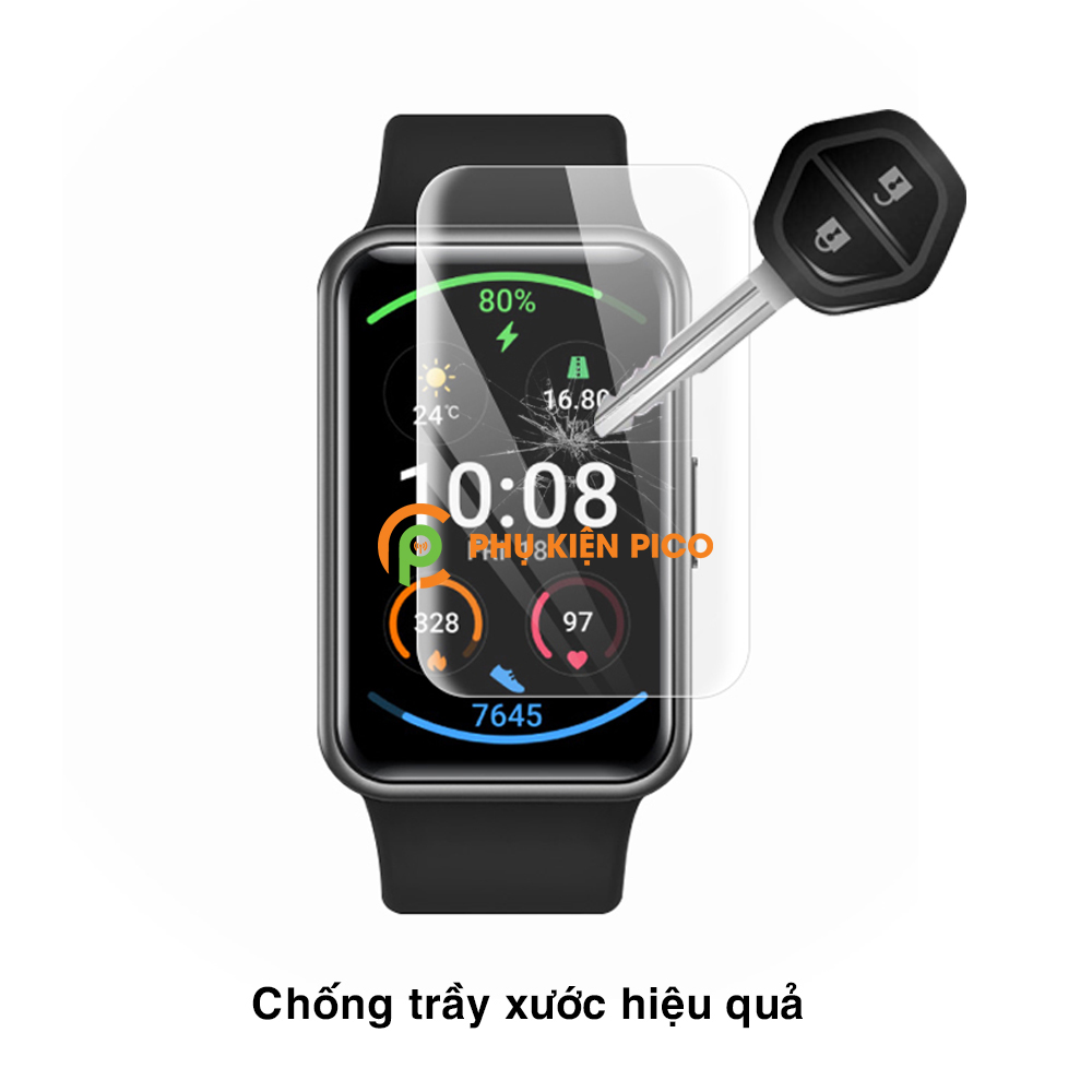 - Dán màn hình Huawei Fit được làm từ chất liệu nhựa TPU cao cấp có khả năng chống trầy xước hiệu quả cho màn hình đồng hồ.