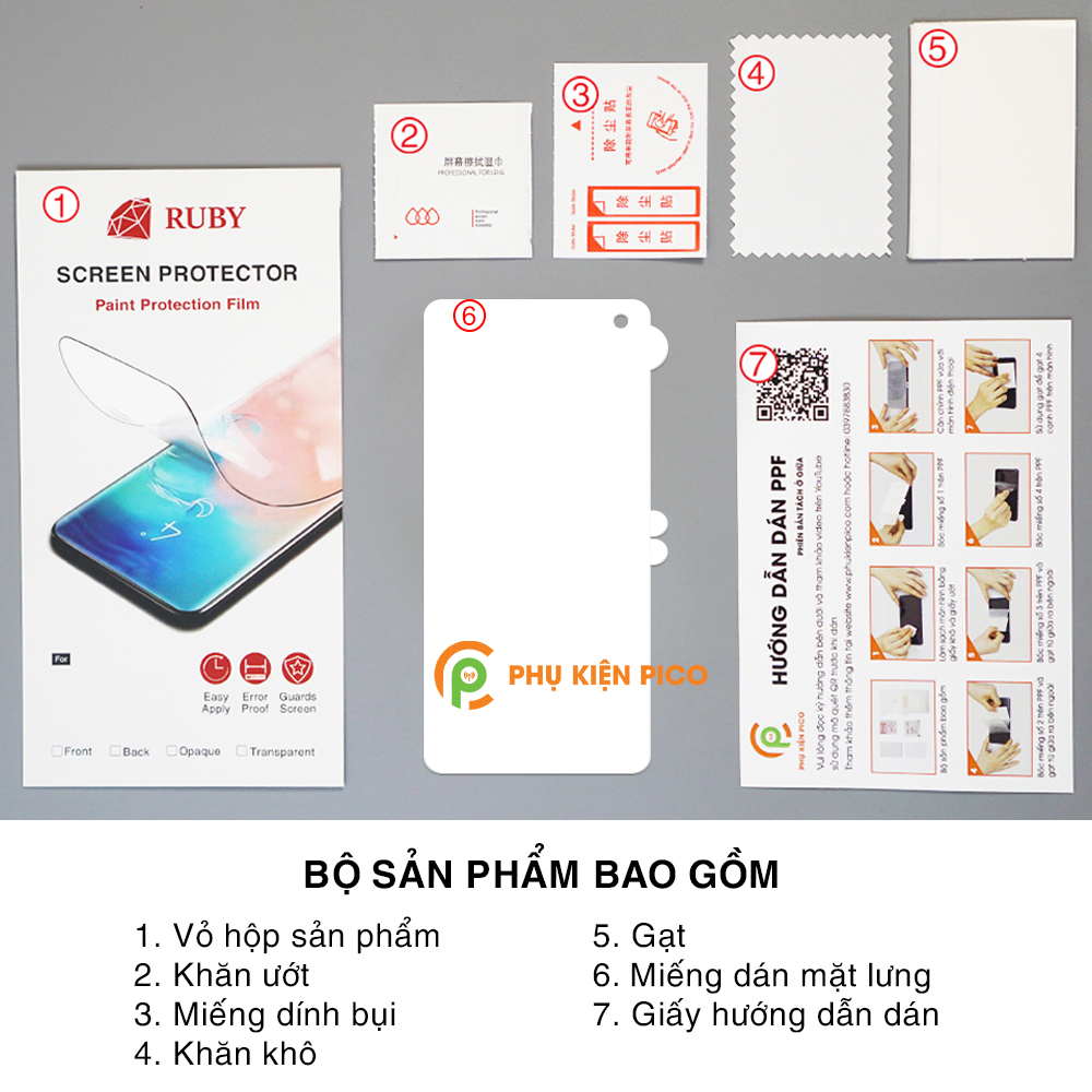 - Bộ sản phẩm gồm có: 1 miếng dán dẻo màn hình + Tặng kèm (1 miếng gạt hỗ trợ dán, giấy lau khô, giấy lau ướt, miếng dính bụi).