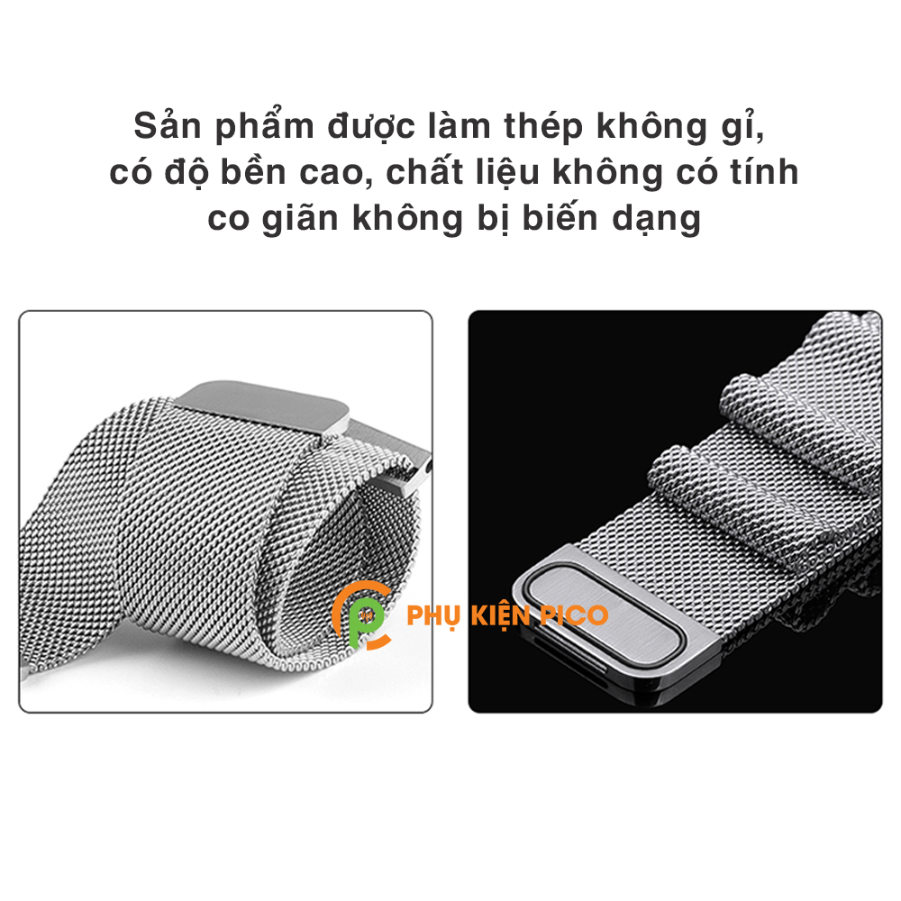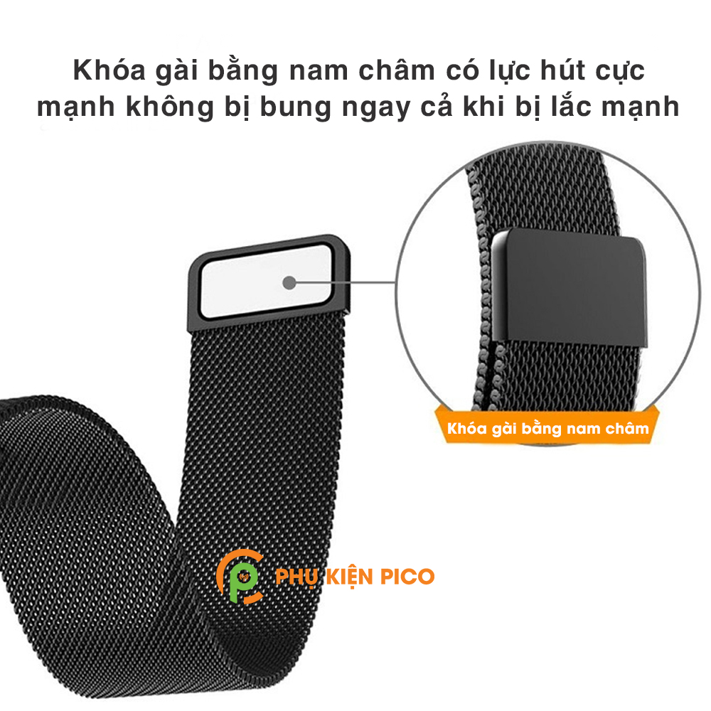 - Dây thép Milanese Loop có khóa nam châm dễ dàng điều chỉnh chiều dài tùy theo kích cỡ cổ tay của người sử dụng. Khóa gài bằng nam châm có lực hút cực mạnh, không bị bung ngay cả khi bị lắc mạnh.