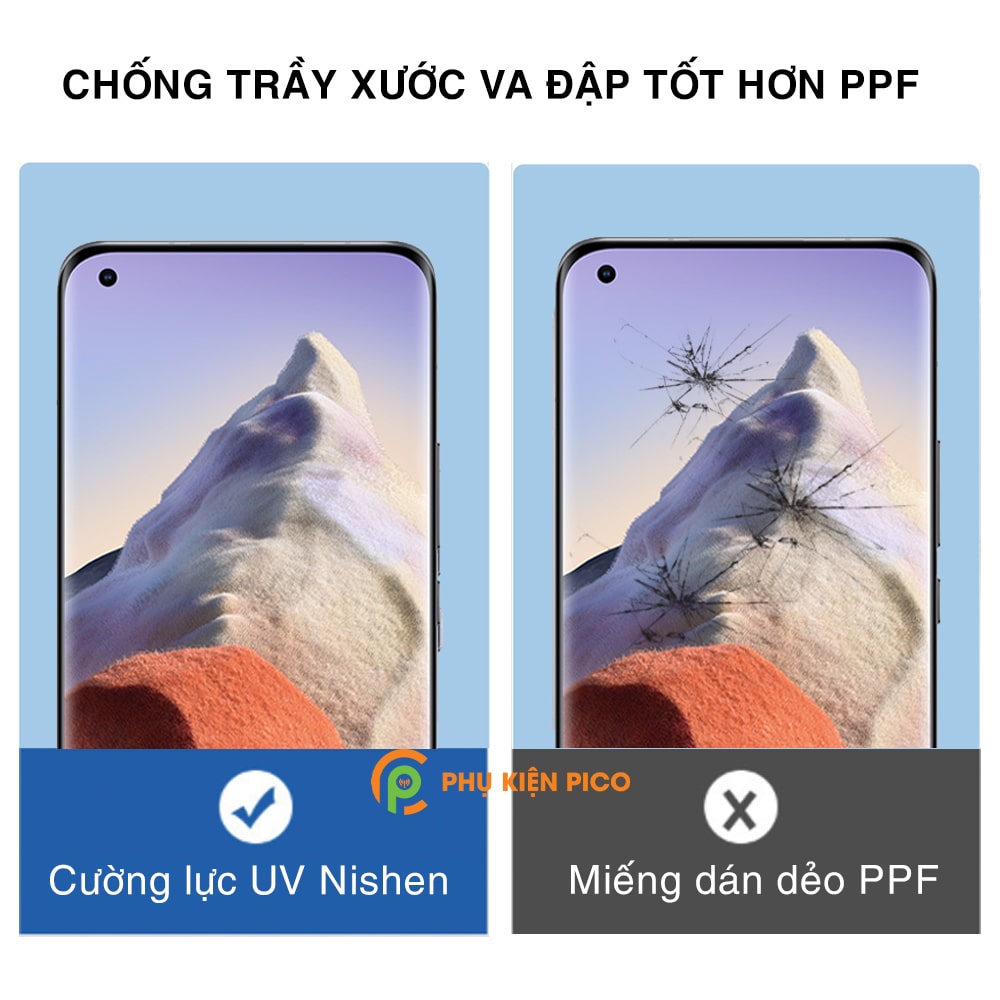 - Cường lực UV Nishen là kính cường lực nên có khả năng bảo vệ màn hình khỏi trầy xước và va đập tốt hơn miếng dán PPF.
