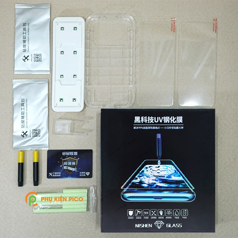 - Bộ sản phẩm Nishen có 2 miếng cường lực (2 lọ keo uv) và bộ phụ kiện hỗ trợ dán, bạn mua về có thể yên tâm ở nhà tự trải nghiệm dán.