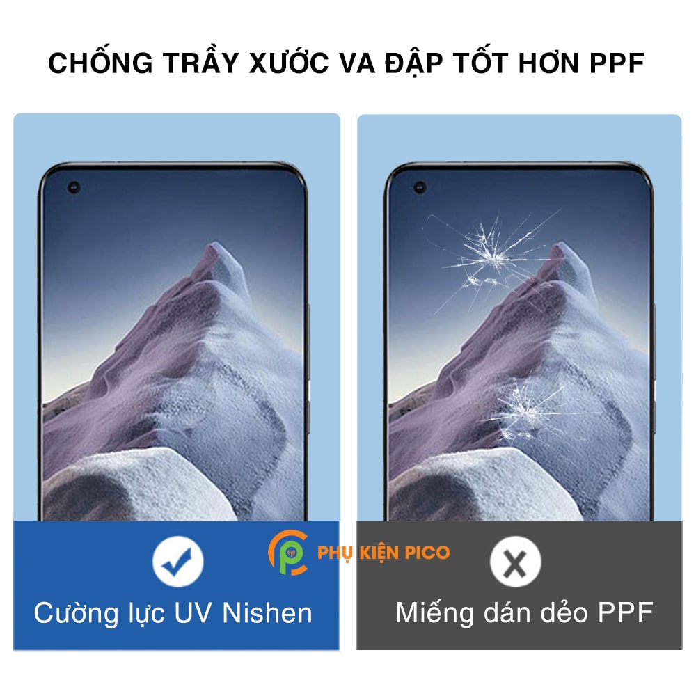 - Cường lực UV Nishen là kính cường lực nên có khả năng bảo vệ màn hình khỏi trầy xước và va đập tốt hơn miếng dán PPF.