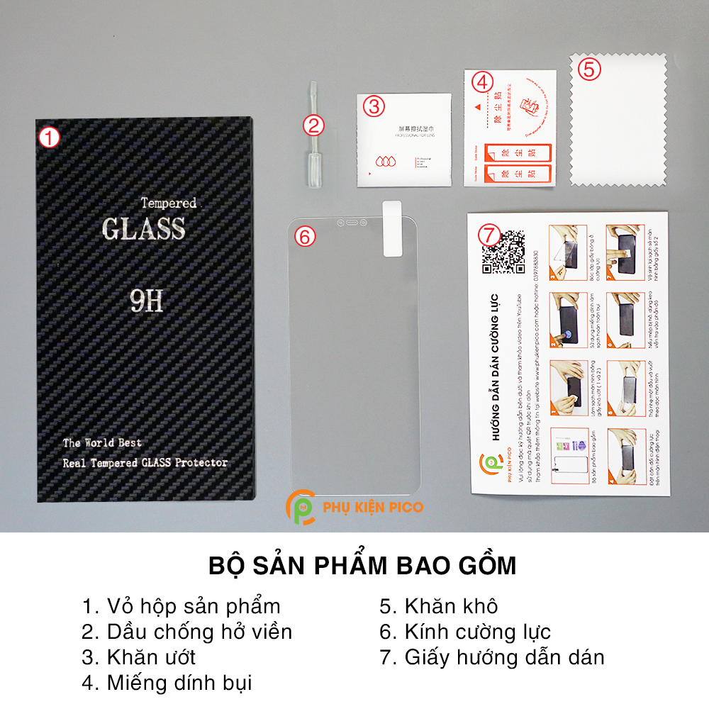 - Bộ sản phẩm nguyên box gồm có: 1 miếng kính cường lực + Tặng kèm (lọ dầu chống hở viền, giấy lau khô, giấy lau ướt, miếng dính bụi, giấy hướng dẫn dán).