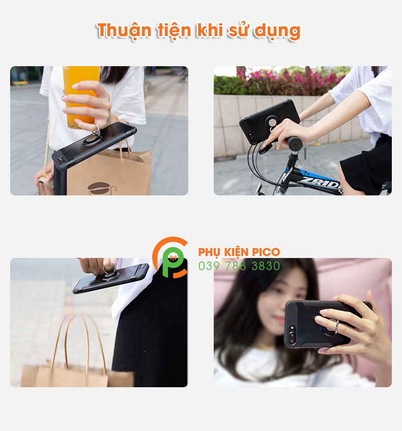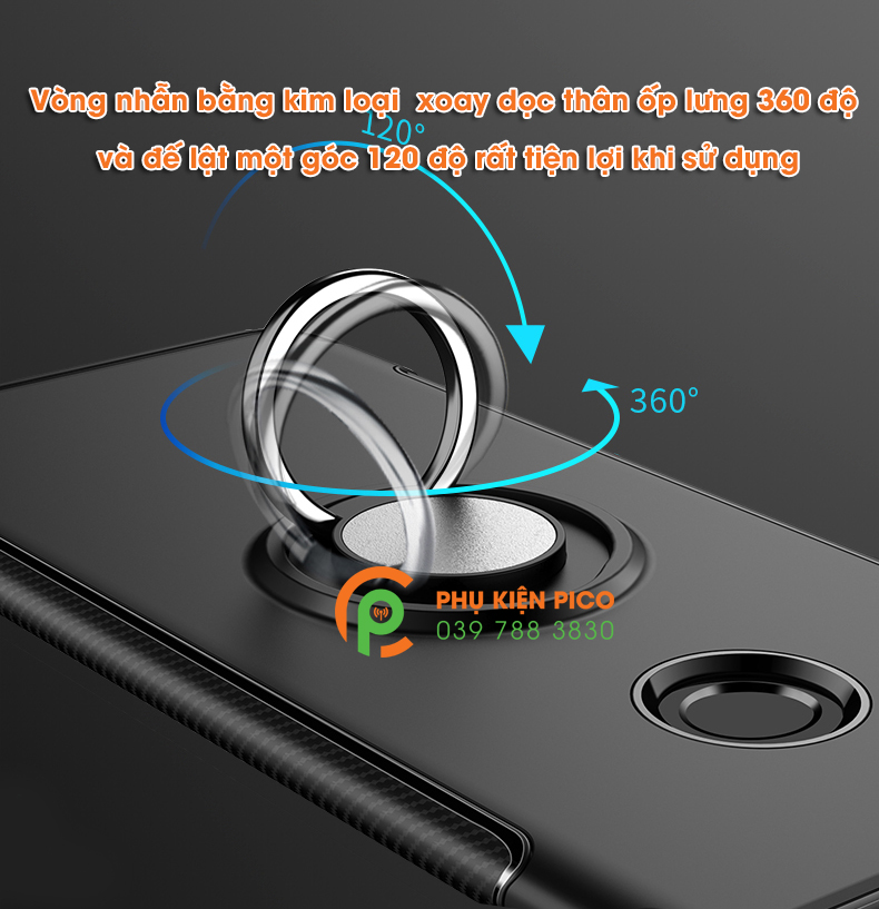 - Vòng nhẫn bằng kim loại chống rỉ sét ôm sát ốp lưng có thể xoay dọc thân ốp lưng 360 độ và đế lật một góc 120 độ rất tiện lợi khi sử dụng.