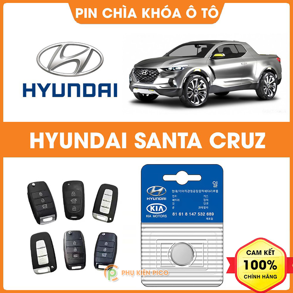 - Pin chìa khóa (pin cúc / pin đồng xu) chính hãng là sản phẩm cung cấp năng lượng để duy trì hoạt động ổn định cho chìa khóa thông minh ô tô Hyundai Santa Cruz.