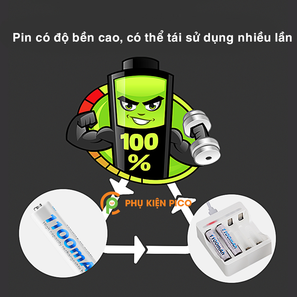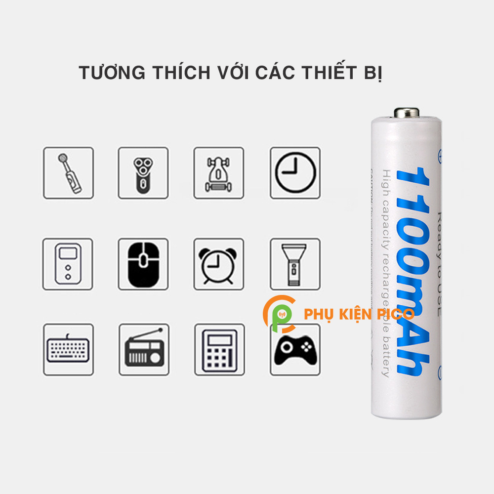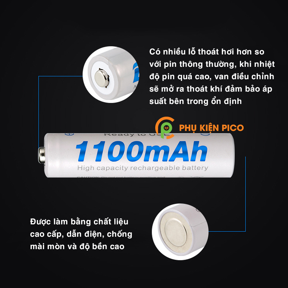 - Pin AAA 1100mAh mang lại lợi thế của viên pin dùng một lần đó là dung lượng cao (1100mAh), được sạc sẵn (pre-charged). Pin có thể sử dụng được ngay sau khi mua về mà không cần qua thao tác nào rắc rối.