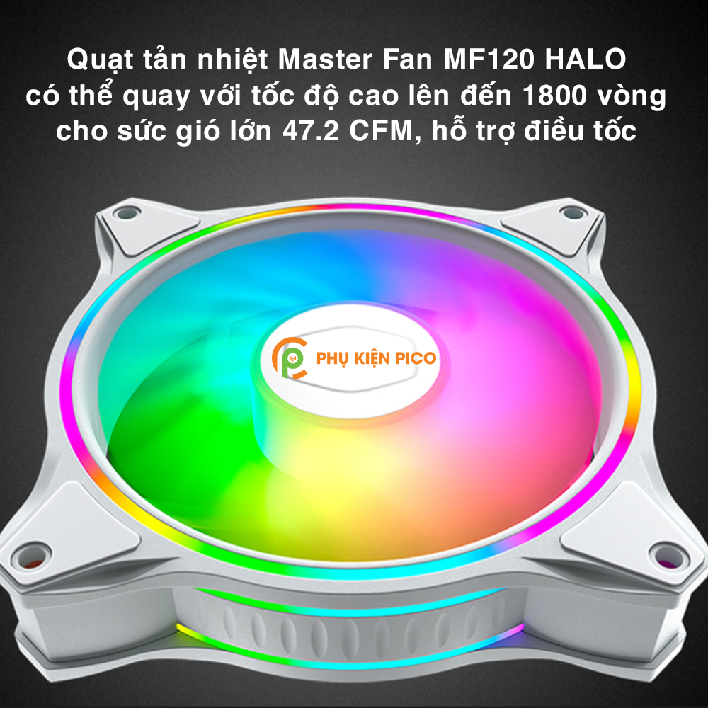 - Quạt tản nhiệt Master Fan MF120 HALO có thể quay với tốc độ cao lên đến 1800 vòng, cho sức gió lớn 47.2 CFM, hỗ trợ điều tốc.