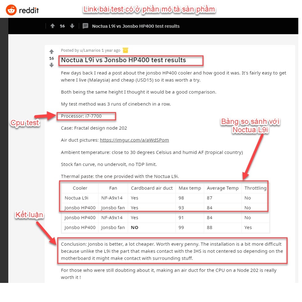 CPU Fan topdown tốt nhất trong phân khúc dưới 500k trên cộng đồng Reddit đã thử nghiệm hiệu năng của Jonsbo HP400 so với Noctua L9i thì Jonsbo HP400 ăn đứt đuôi luôn.
