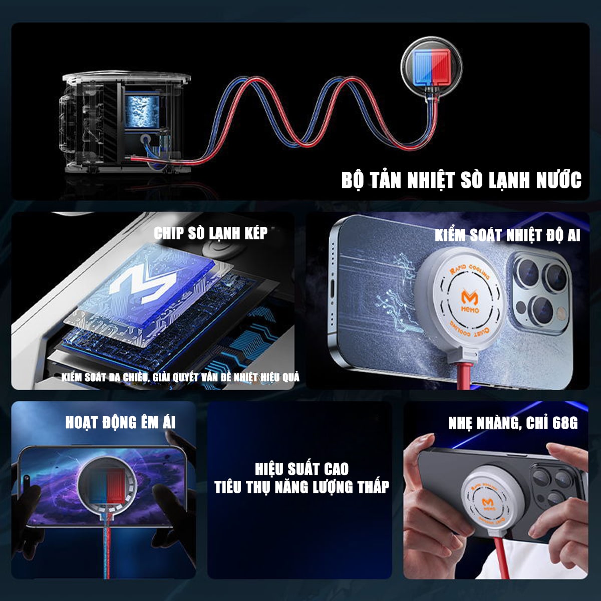 - Quạt tản nhiệt điện thoại Memo DL19 sử dụng công nghệ giải nhiệt bằng chất lỏng với một buồng chứa hơi chất lỏng, có tích hợp quạt. Quạt thổi làm mát nước và thông qua một ống dẫn, nước mát chạy lên bộ tản nhiệt được gắn vào mặt lưng điện thoại. Trong quá trình làm lạnh, nhiệt độ thu được từ điện thoại sẽ được mang trở về làm mát theo chu trình khép kín.