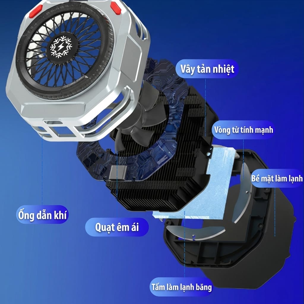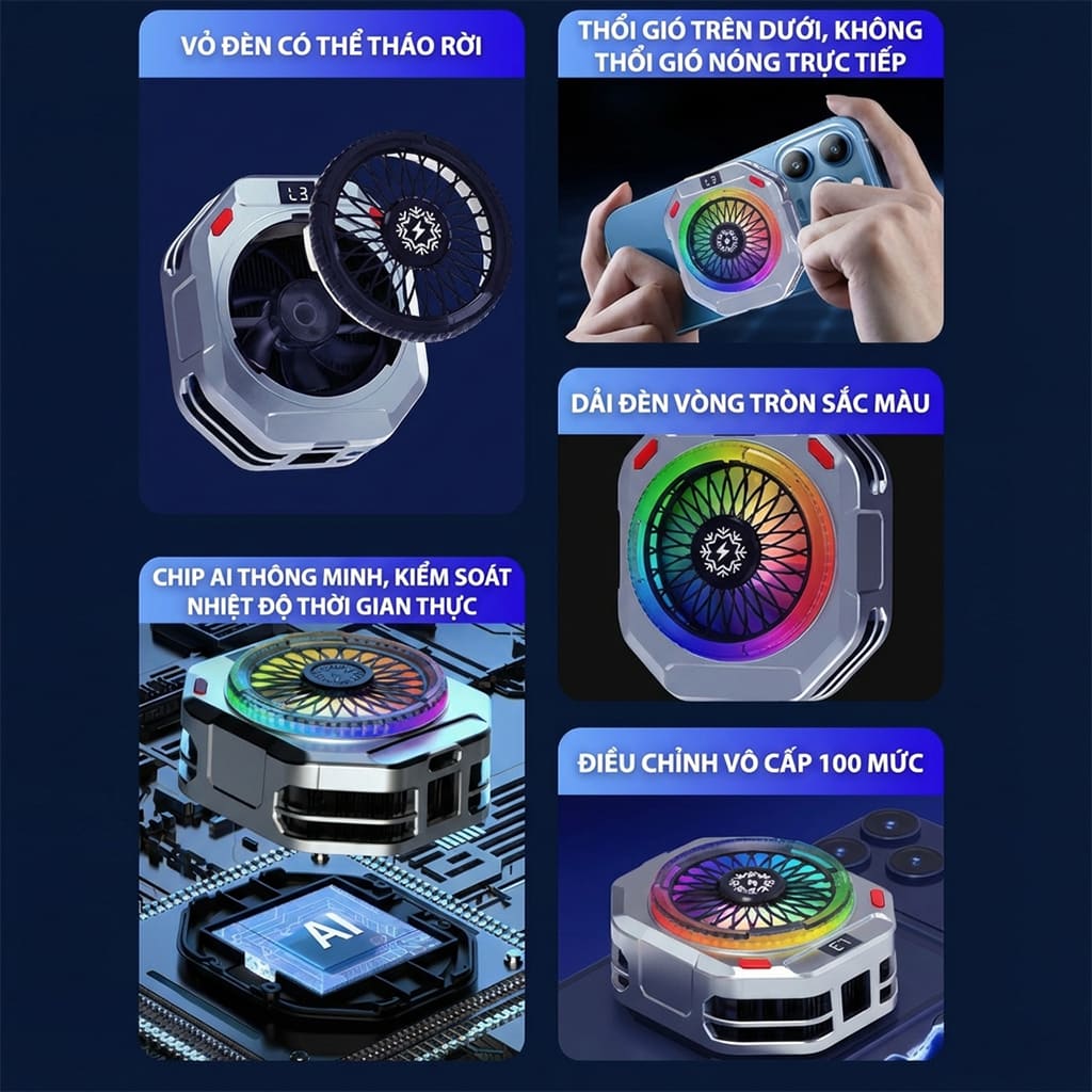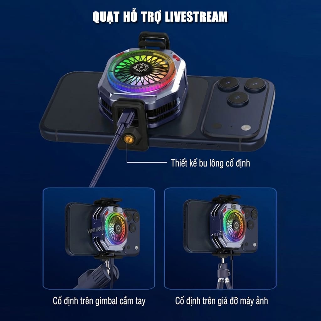 • Gắn vào điện thoại bằng từ tính hoặc ngàm kẹp rời tiện lợi. Ngàm quạt hỗ trợ gắn Tripod hỗ trợ Livestream.