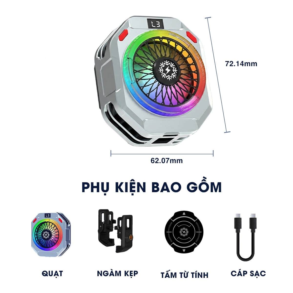 • Bộ sản phẩm gồm có: 1 quạt, 1 bộ ngàm, 1 tấm từ tính, 1 cáp sạc