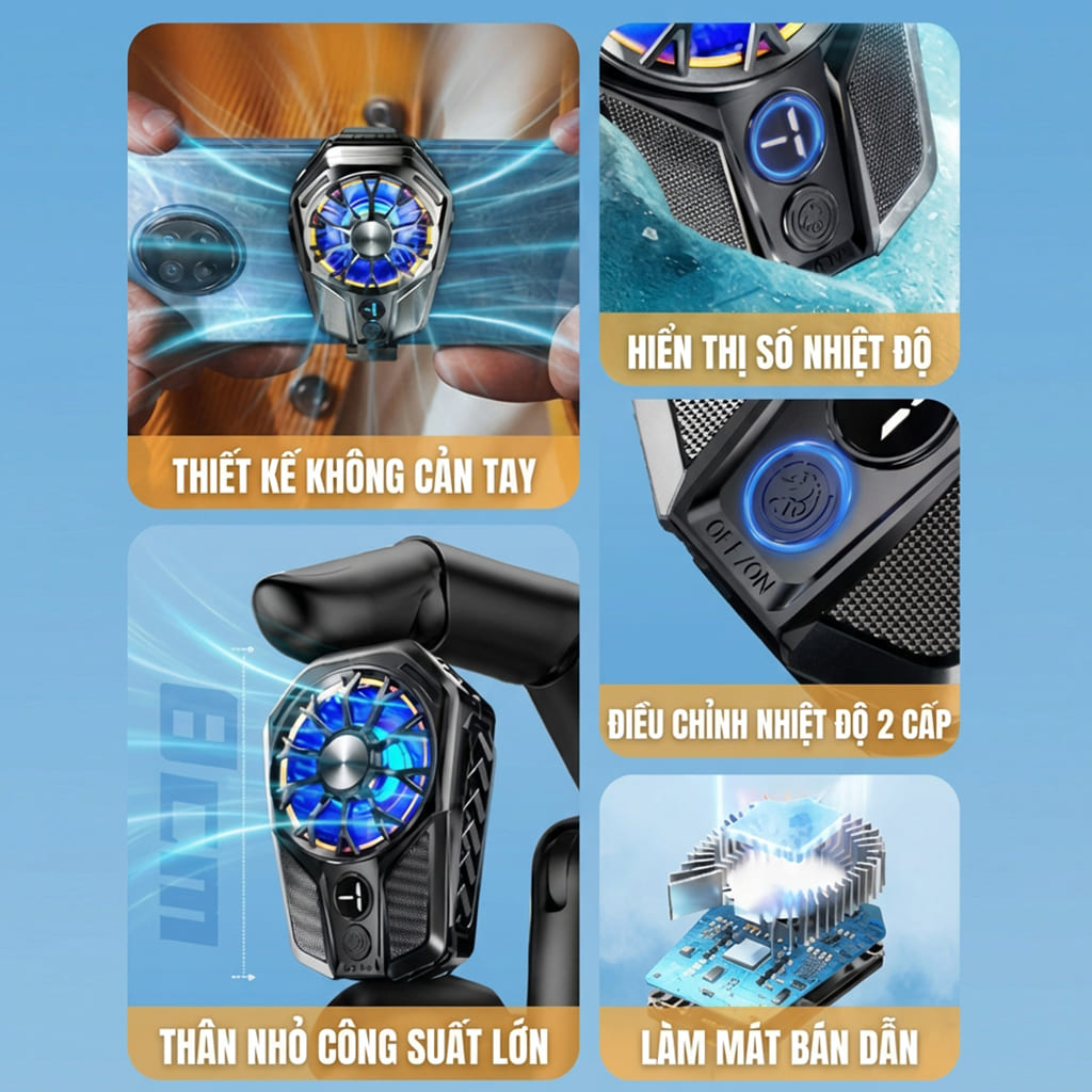- Quạt gắn vào điện thoại bằng ngàm kẹp tiện dụng.