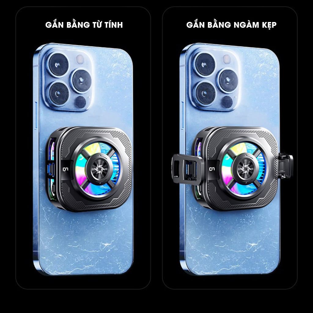 • Quạt gắn vào điện thoại bằng từ tính nam châm hoặc ngàm kẹp (có thể tháo rời) tiện dụng.